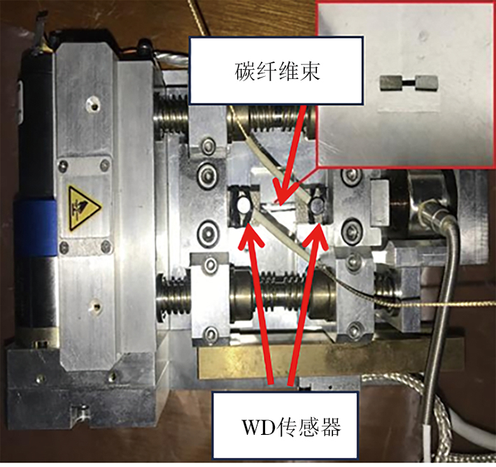 碳纤维束拉伸试件的长×宽为45 mm×3 mm,利用SEM测试仪类型的原位拉伸机拉伸样本,并使用AE传感器接收AE信号,试验现场如图1所示(图中WD传感器为宽频带传感器)。以5 mm·min−1的拉伸速率拉伸试件直至断裂,观察并记录失效过程中的损伤模式以及试验现象。