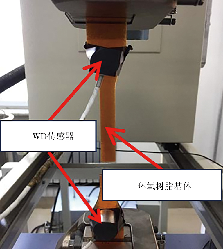 根据GB/T 2567—2008《树脂浇铸体性能试验方法》对环氧树脂基体进行拉伸试验,基体试件为哑铃型环氧树脂浇注体,尺寸(长×宽×高,下同)为250.0 mm×25.0 mm×2.5 mm。使用岛津AG-X电子万能试验机拉伸试件,AE传感器在拉伸过程中接收AE信号,试验现场如图2所示。以5 mm·min−1的拉伸速率拉伸基体直至断裂,观察并记录失效过程中的损伤模式以及试验现象。