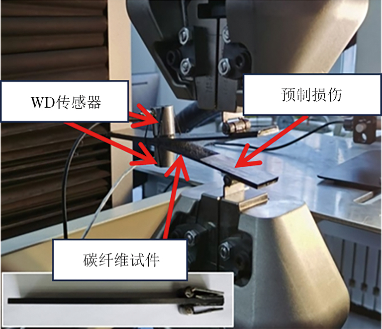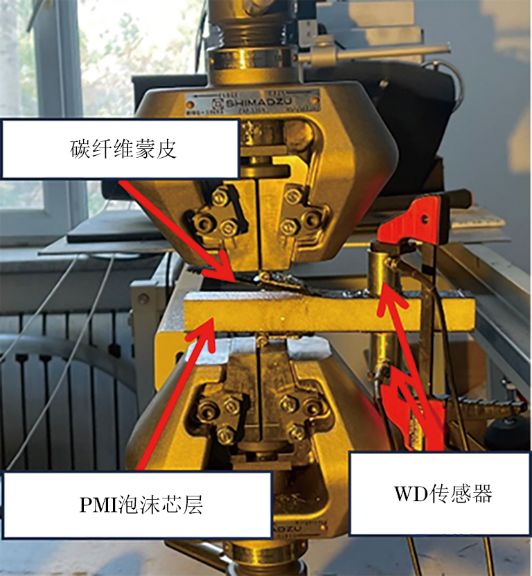 根据ASTM D 5528-13 标准对尺寸为178.00 mm×20.00 mm×22.04 mm的CFRP-PMI夹层试件进行分层试验。试件中插入尺寸为55 mm×25 mm×40 µm的聚四氟乙烯(PTFE)膜作为预制分层,一对铰链被粘贴于预制损伤的一端。然后向铰链施加拉伸载荷进行分层试验,AE传感器在加载过程中接收AE信号,试验现场如图4所示。以1 mm·min−1的拉伸速率拉伸夹层试件直至其完全分层,观察并记录失效过程中的损伤模式以及试验现象。