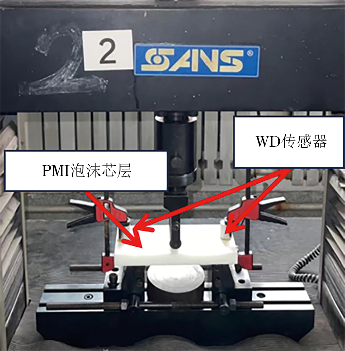 根据ASTM D 790-03Standard test methods for flexural properties of unreinforced and reinforced plastics and electrical insulating materials标准对尺寸为200 mm×100 mm×22 mm的PMI泡沫芯进行三点弯曲试验,使用SANS万能试验机对试件进行加载,AE传感器在加载过程中接收AE信号,试验现场如图5所示。以1 mm·min−1的加载速率弯曲泡沫芯直至试件断裂,观察并记录失效过程中的损伤模式以及试验现象。