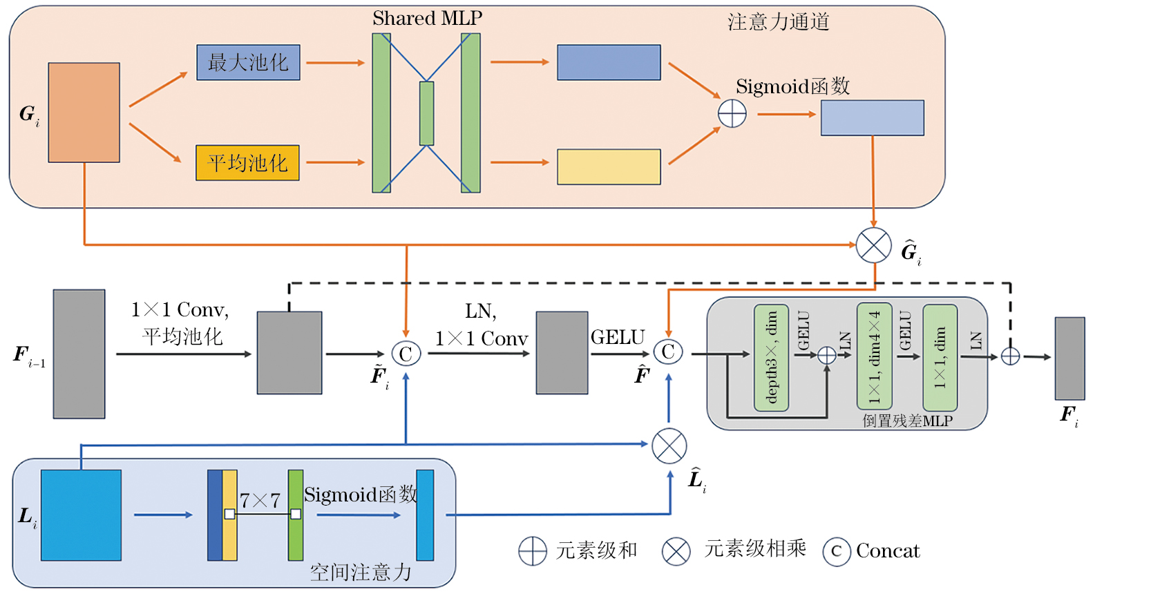 式中:CA为通道注意力机制;SA为自注意力机制;Concat为通道维度;IRMLP为倒残差多层感知机;为元素级相乘;为通过通道注意力组合生成;为通过空间注意力组合生成;为通过前一阶段的HFF模块下采样生成;为全局-局部特征与前一阶段融合的结果。